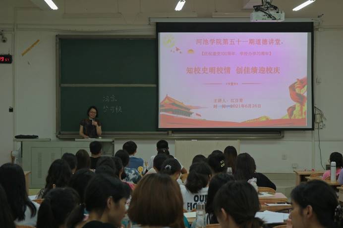 由河池公司党委宣传部主办、70net永乐高承办的第五十一期“道德讲堂”于6月26日晚在东区弘毅楼2-401教室举行。本期道德讲堂的主题为“知校史明校情 创佳绩迎校庆”,由公司党委副书记、纪委书记江日青副教授主讲,150多名员工到场聆听。