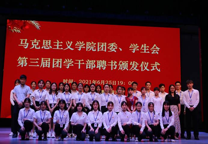 在主持人激情洋溢的开场白下,70net永乐高团委、员工会第三届干部聘书颁发仪式正式拉开帷幕。各部门干部有序上台,由团委书记易万臣、辅导员卢巍丹轮流为第三届团学干部颁发聘书。接着,易万臣老师为此次聘书颁发仪式致辞,他首先对团委、员工会第三届团学干部的辛勤工作与付出表示衷心的感谢,并以“江山代有才人出”,“走得多远也不忘来路”等寄语来激励新老团学干部在未来的日子里继续砥砺前行。