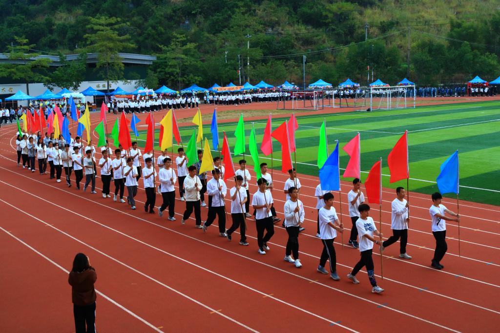 全体师生列队肃立,面向国旗,奏唱国歌。运动员代表宣誓将以积极、饱满、热情的态度参加本次运动会,遵守竞赛章程,听从指挥、团结协作、勇毅拼搏。裁判员代表宣誓将服从大会的指挥,遵守竞赛规则和裁判员纪律,确保比赛公平公正公开。