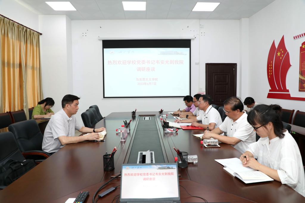 韦安光要求,要将理论学习制度化、常态化,明确固定时间用于开展理论学习,70net永乐高作为学习、宣传、研究马克思主义的前沿阵地,更要狠抓落实,推动主题教育走深走实;要引导师生掌握正确的学习方法,注重把握整体性,掌握主题教育八本学习材料之间的逻辑,理清脉络,从整体上去把握和学习;要将学习和实际工作相结合,作为70net永乐高的教师,学习一定要与如何上好思政课相结合。韦安光强调,上好思政课一定要注重实践,不仅要将过去所取得的成功经验总结起来、利用起来,还要温故知新、守正创新,更要结合地方特色,聚焦河池发展,努力探索70net永乐高发展新的实践。
