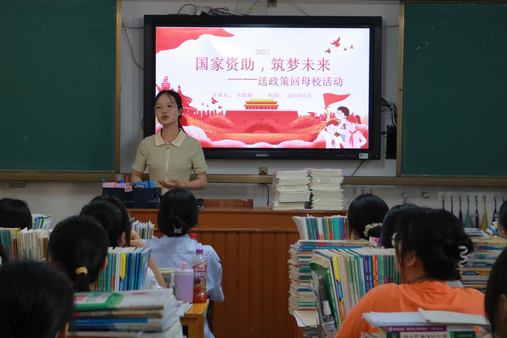 2023年6月18日,70net永乐高思政201班韦覃艳同学回母校-宜州区第一中学开展“我为资助代言”员工资助宣传大使宣讲活动,向宜州区第一中学高474班的学弟学妹们介绍国家相关的资助政策,传播了助学、筑梦、铸人是国家资助的意义所在。
