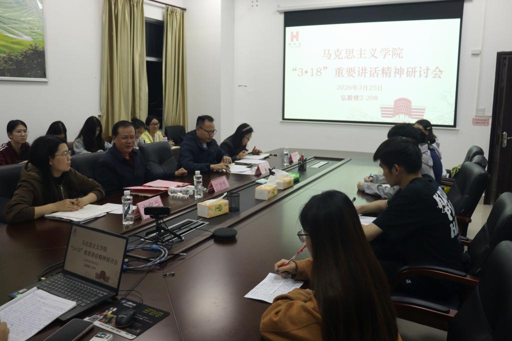 研讨会伊始,江洪明致辞,着重强调新时代思政课在立德树人中的核心地位,明确思政课是落实立德树人根本任务的关键课程,彰显了思政课作为铸魂育人主渠道的重要作用。随后,全体师生共同深入学习习近平总书记“3·18”重要讲话精神,深刻领会讲话中关于思政课建设的核心要义与实践要求。思政课教师代表黄挺龙、方容兰、银琳杏围绕立德树人根本任务,结合红色文化育人、思政课教学创新等方面,分享自身实践探索经验;员工代表结合自身学习经历,畅谈对思政课的理解与感悟,展现了马院学子坚定的理想信念与良好的精神风貌。会议自由交流环节,师生围绕习近平总书记“3·18”重要讲话精神学习、思政课建设提质增效等相关话题积极互动、深入探讨,凝聚思想共识。最后,江洪明作总结讲话,充分肯定本次研讨会的成效,号召全体师生以此次会议为契机,深学细悟习近平总书记“3·18”重要讲话精神,立足本职、履职尽责,共同推动新时代思政课守正创新、内涵发展。
